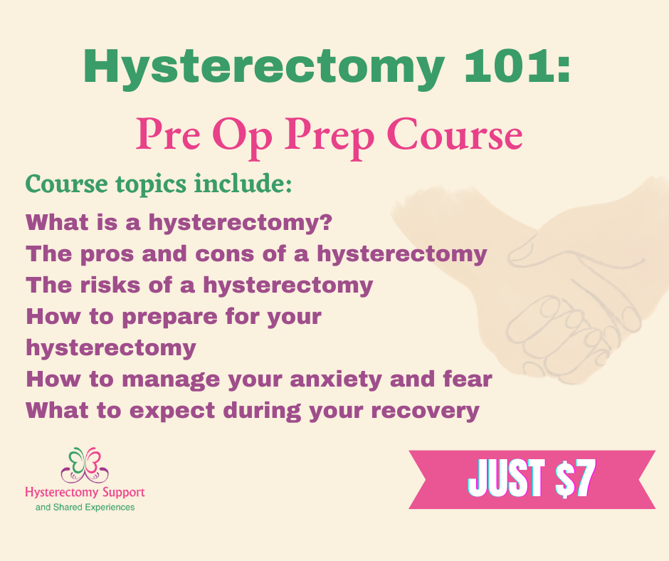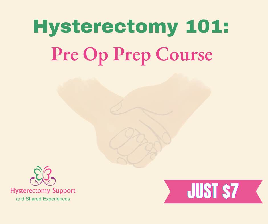 The Hysterectomy 101: Pre Op Prep Course is the perfect way to prepare for your hysterectomy. It's affordable, convenient, and very informative.